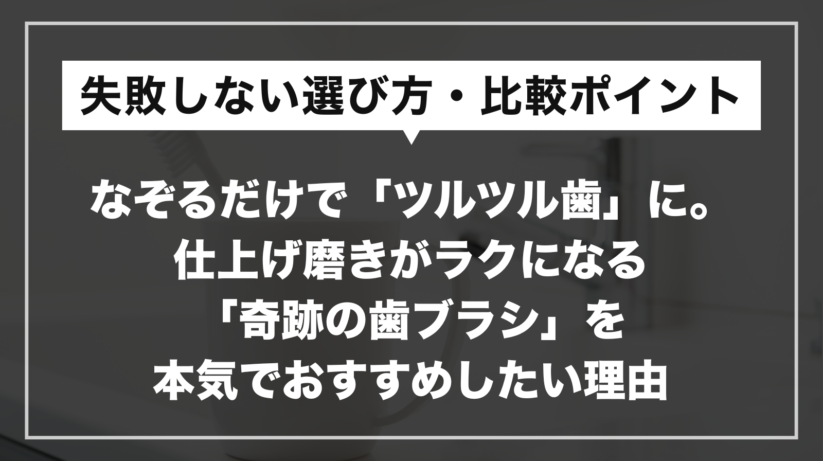 | 奇跡の歯ブラシ | 大人全般 | 独自ピラミッドヘッド。すき間汚れに強い | やさしい | 中価格帯 | 軽くなぞるだけでOK |